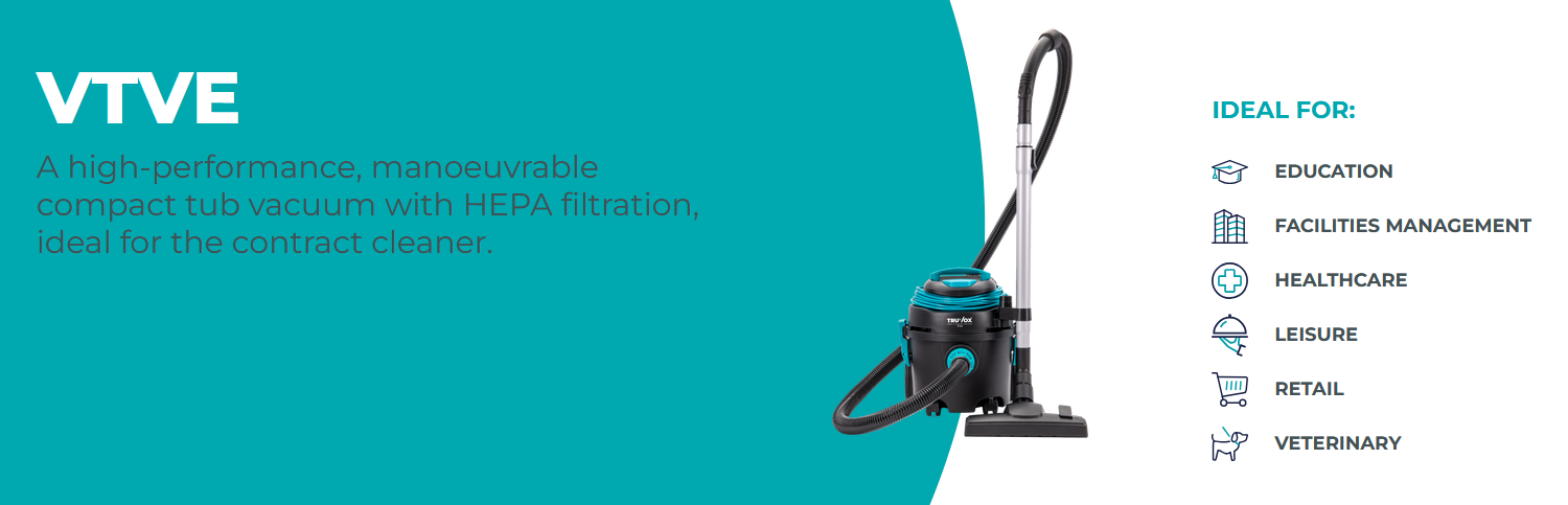 The VTVe Vacuum is a lightweight, high-performance tub vacuum with 10L capacity, HEPA 13 filtration, and a compact design. Efficient, easy to use, and ideal for contract cleaners, it offers reliable cleaning with minimal downtime.